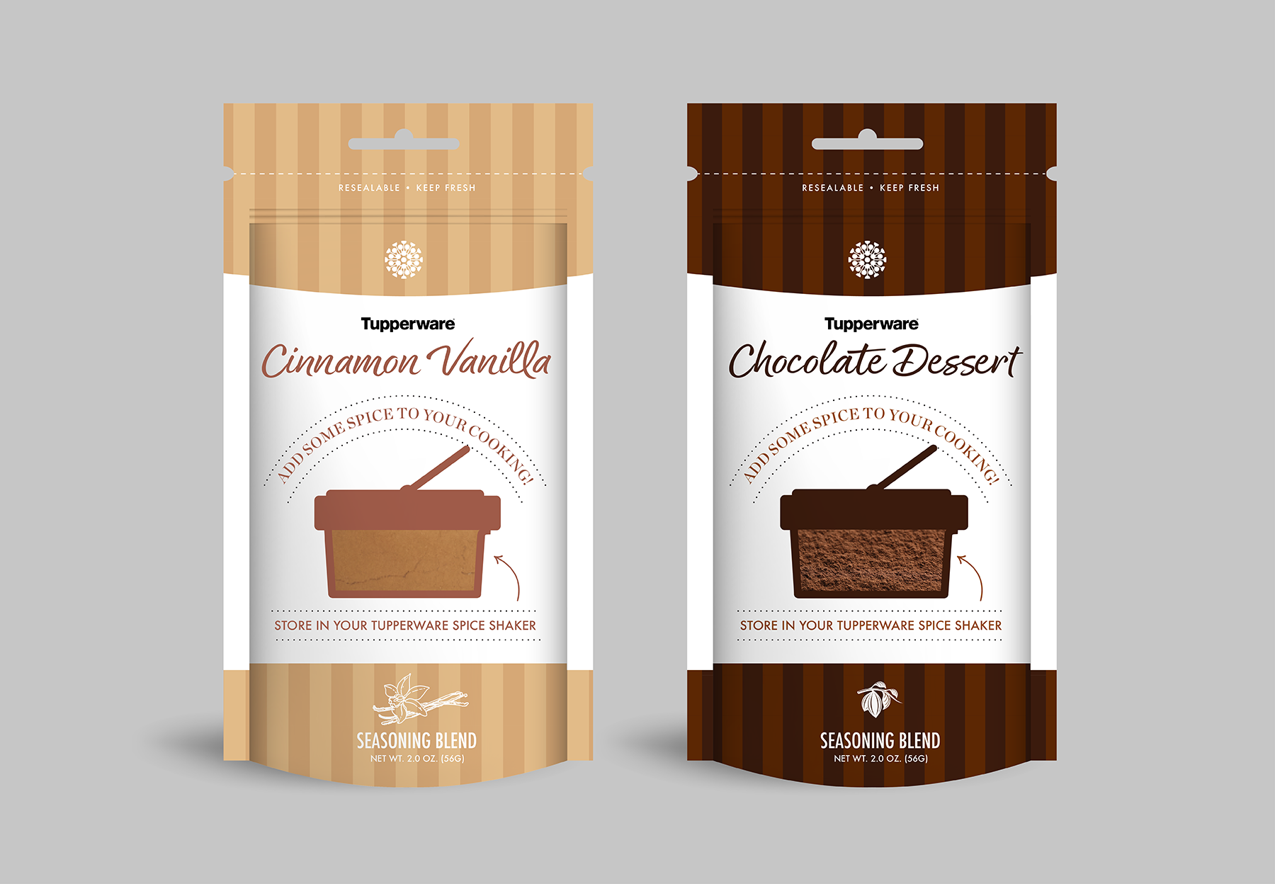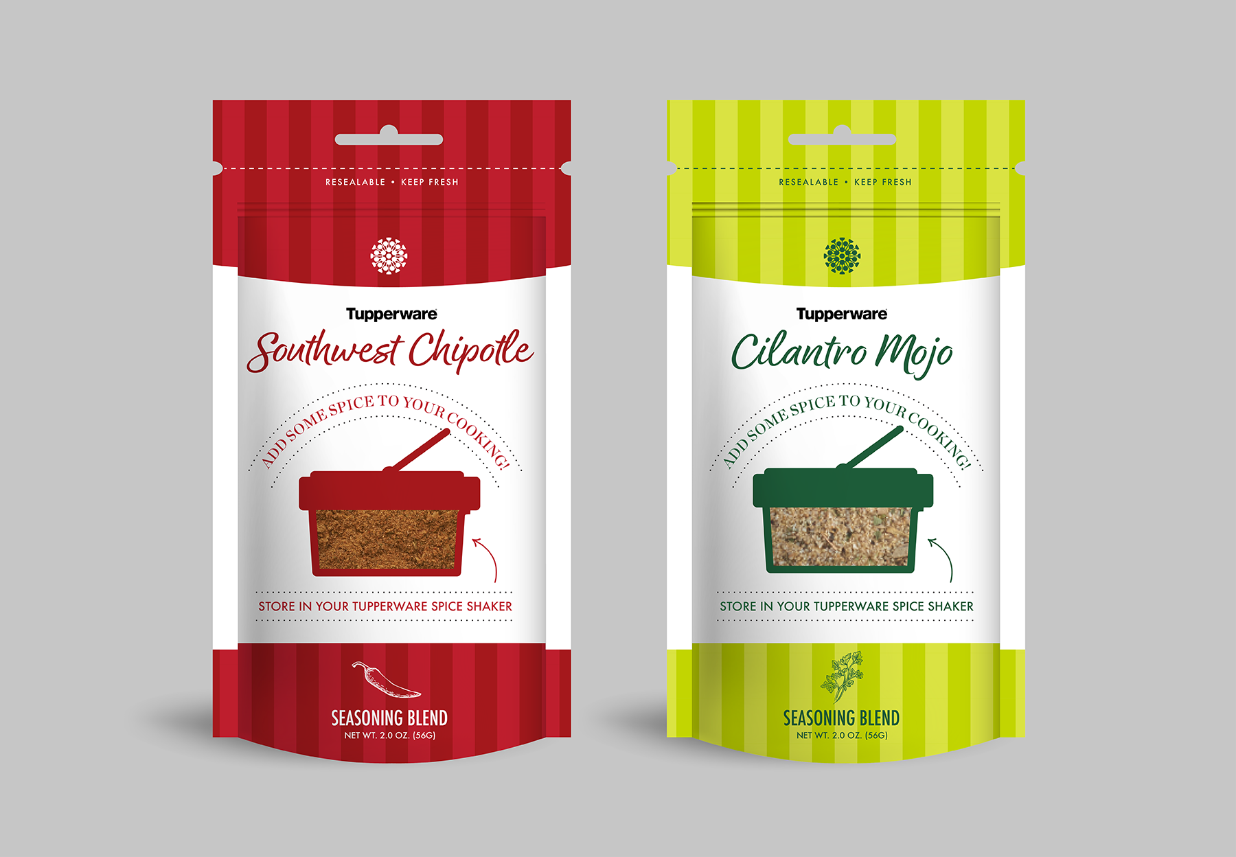 A packaging design created for a series of Tupperware Seasoning Blends. The seasoning blends were part of a new product launch for Tupperware Spice Shakers.