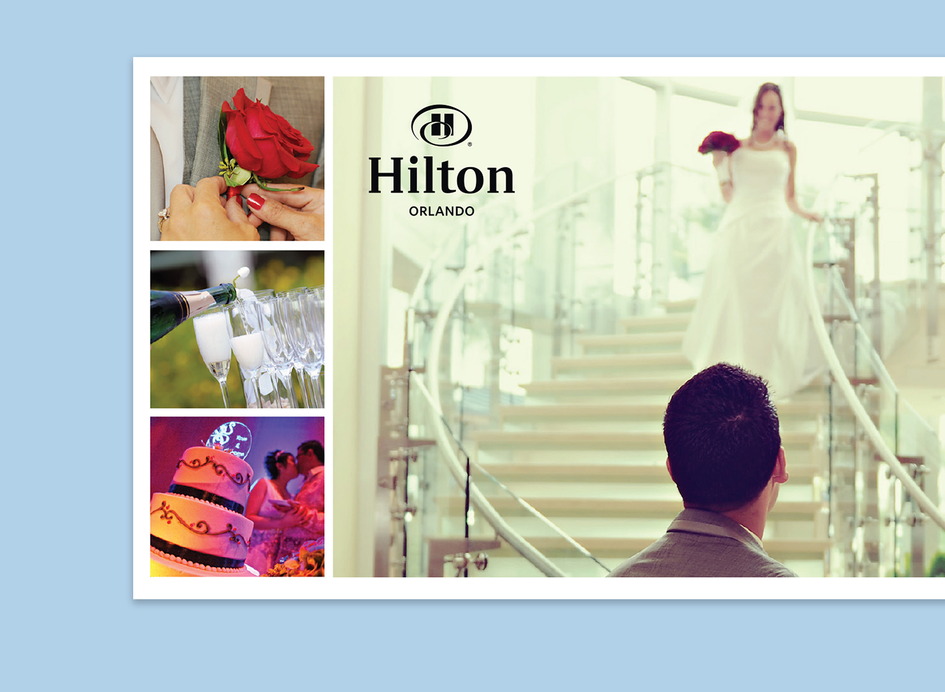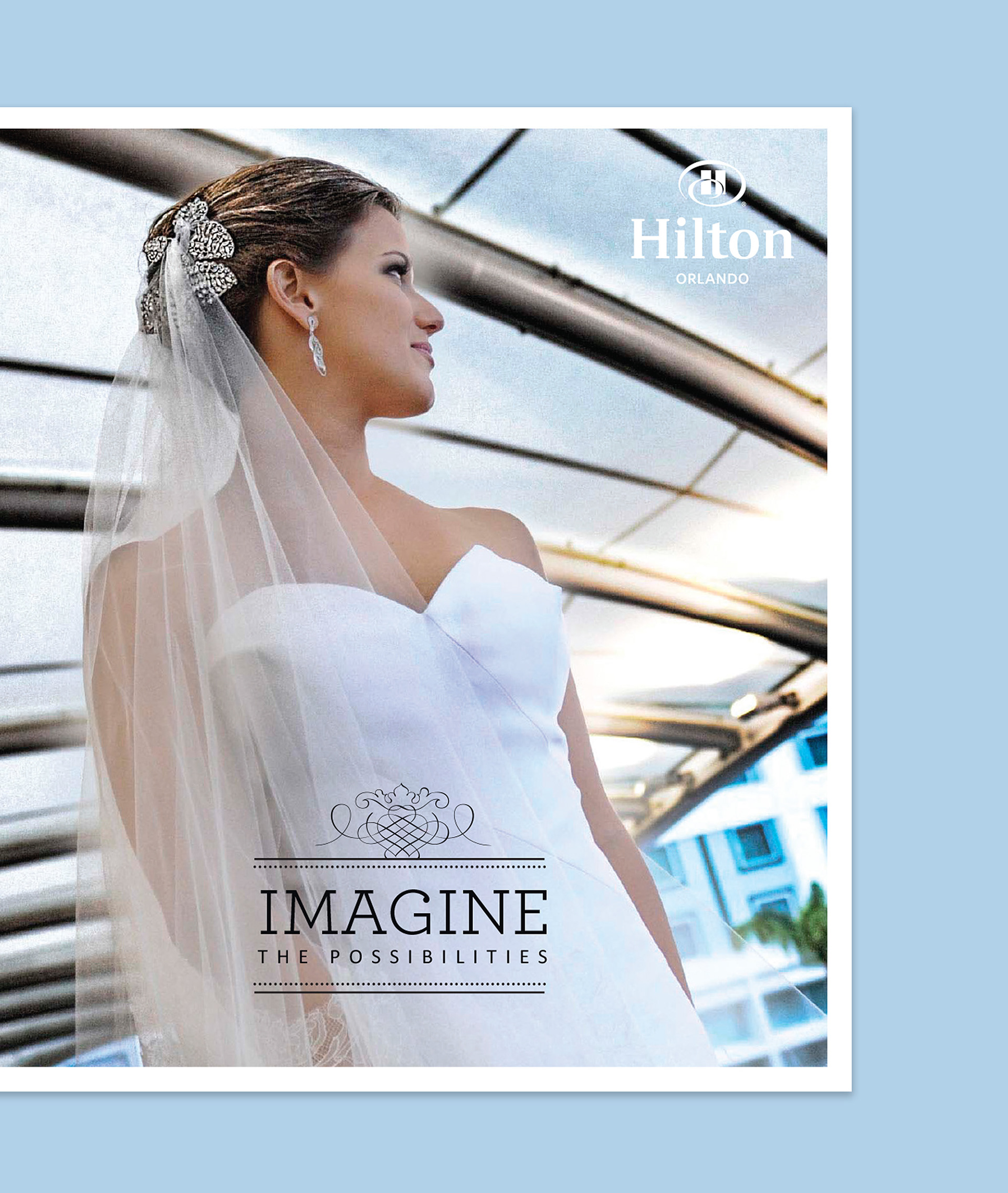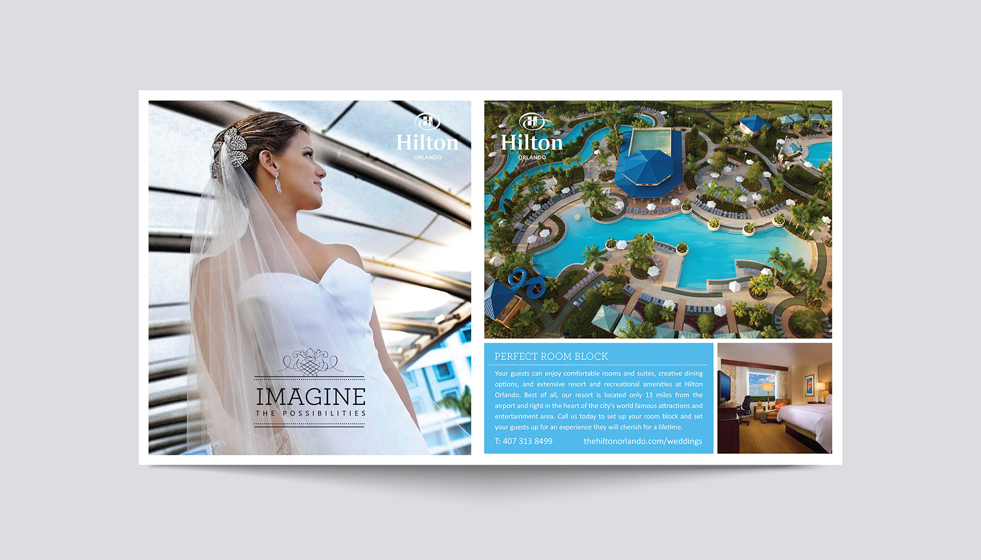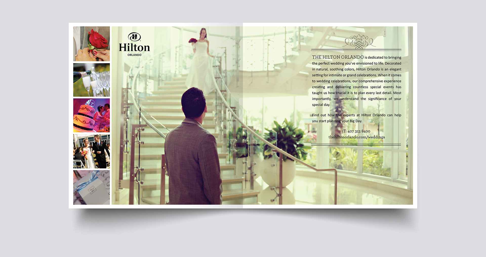 A bi-fold two page spread promoting wedding event services at Hilton Orlando. This ad was placed in multiple national magazines and wedding event publications and led to an increase in wedding bookings for Hilton Orlando.
