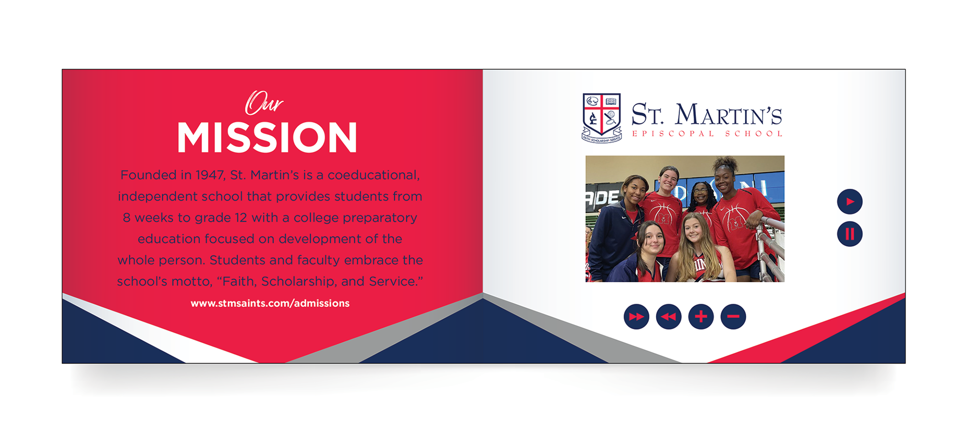 A promotional brochure for St. Martin’s Episcopal K-12, a private college preparatory school based in New Orleans. This brochure highlighted the advanced academic and athletic opportunities offered students. It included a video player and was sent to prospective students and their families.