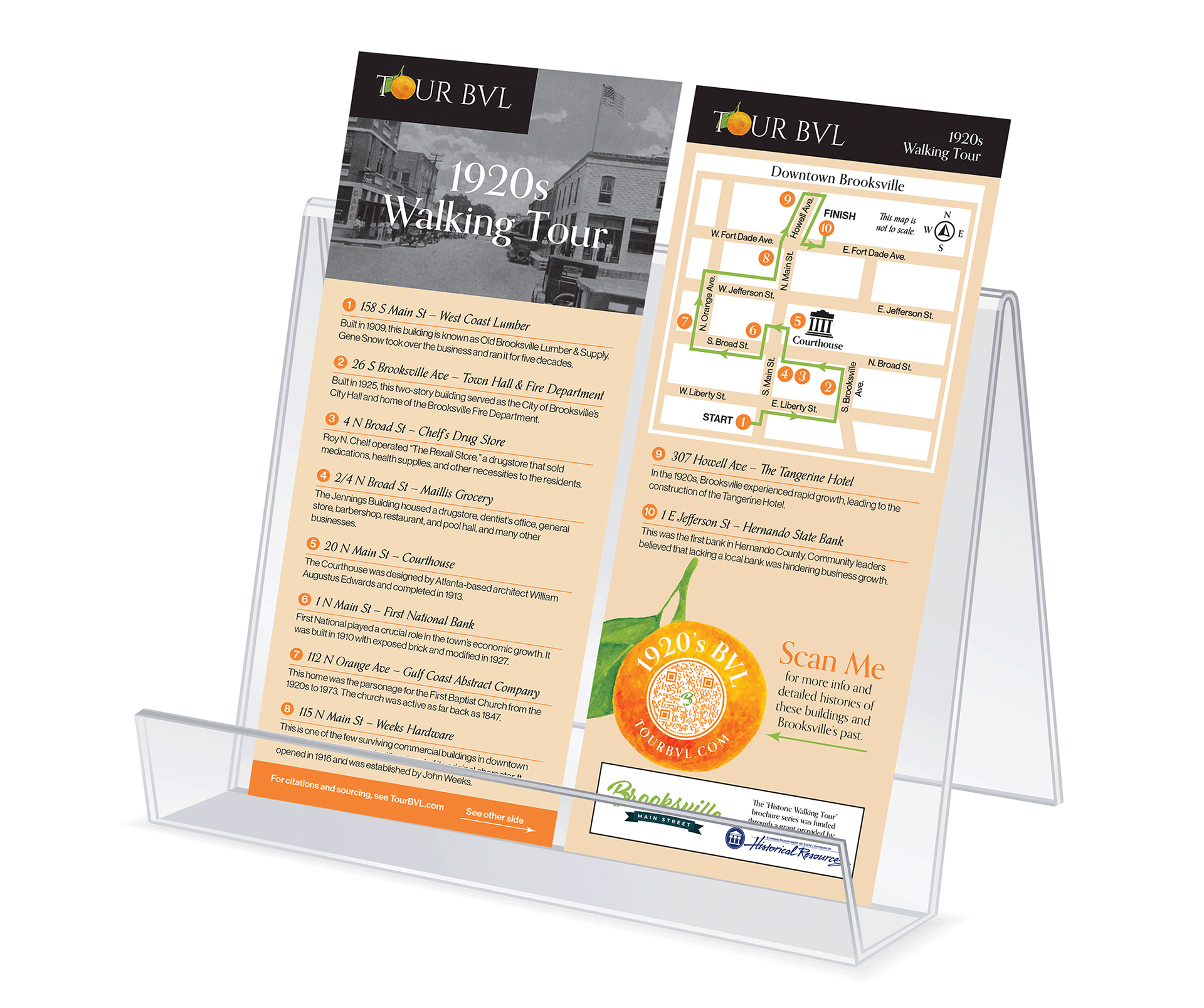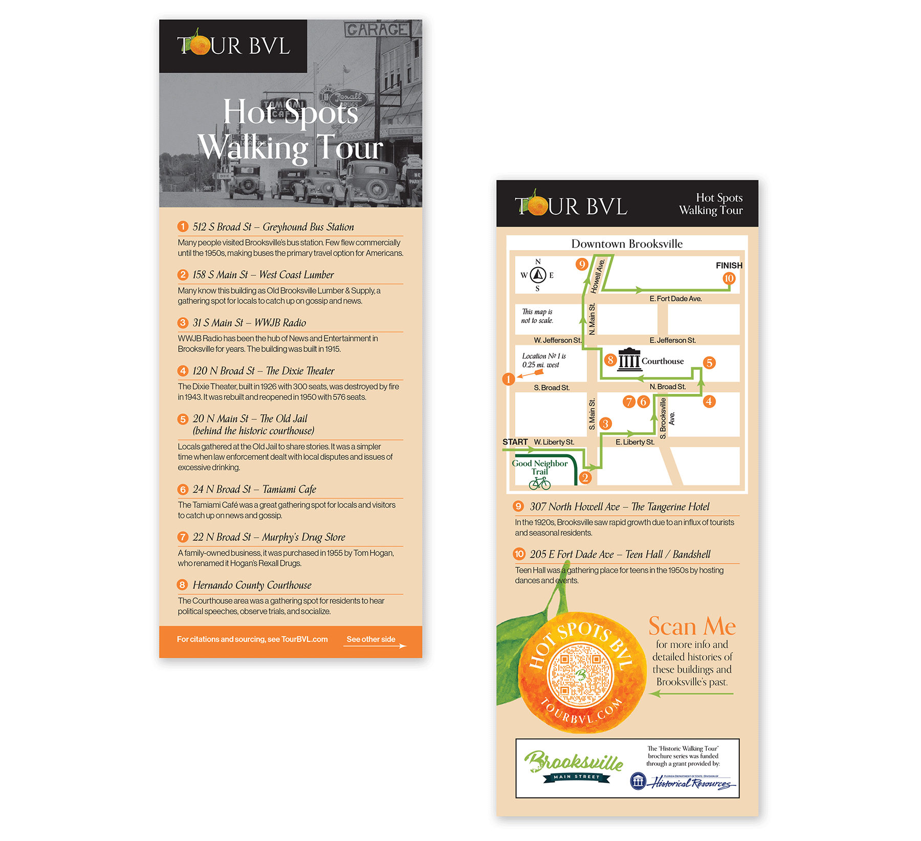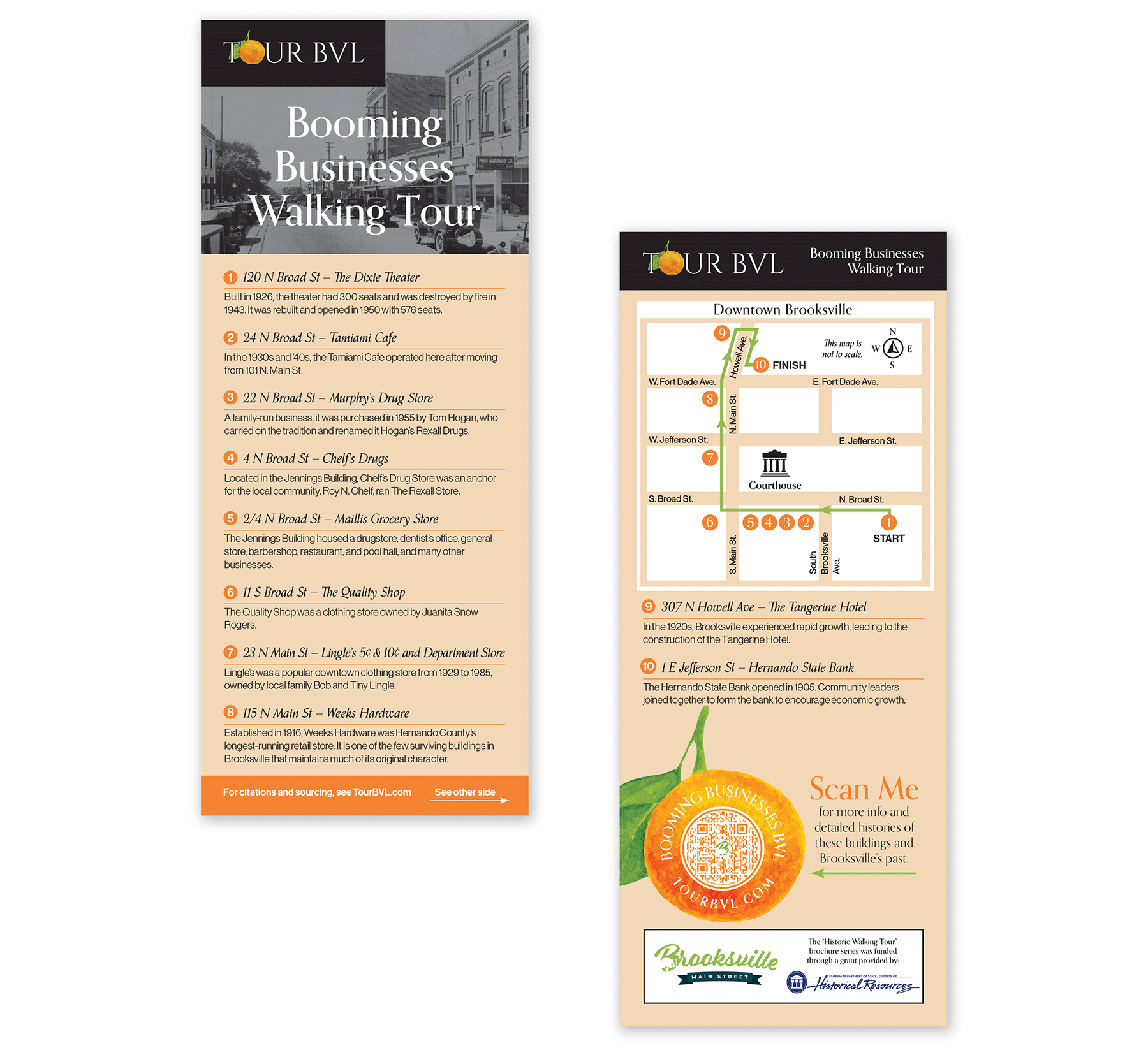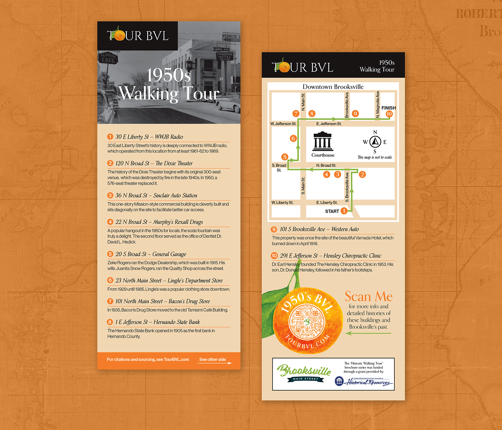 I designed a series of rack cards for Tour BVL, an organization of volunteers dedicated to sharing the history and culture of downtown Brooksville, Florida. These rack cards highlight the buildings, streets and people that make up the city's history. The back of the cards depict a self-guided walking tour map highlighting which landmarks to look for along the way. These cards were distributed to businesses throughout Brooksville.